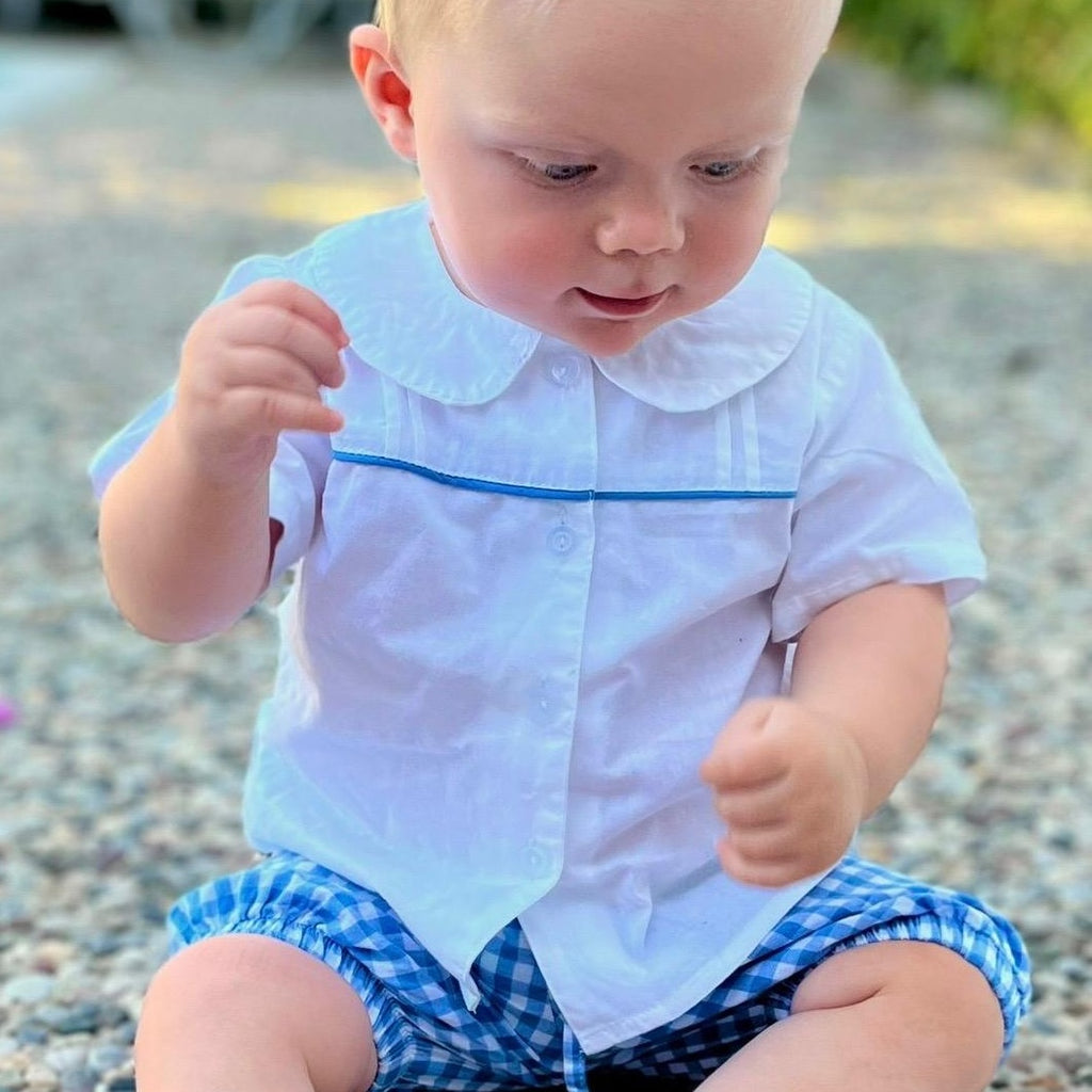 English Rose LinensA traditional Romper Suit with 2 soldiers on the front, this is made with blue and white striped cotton which is very soft. The suit is fully lined throughout. It could be worn with a normal baby grow underneath, or for an occasion how about baby's first shirt ! .