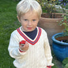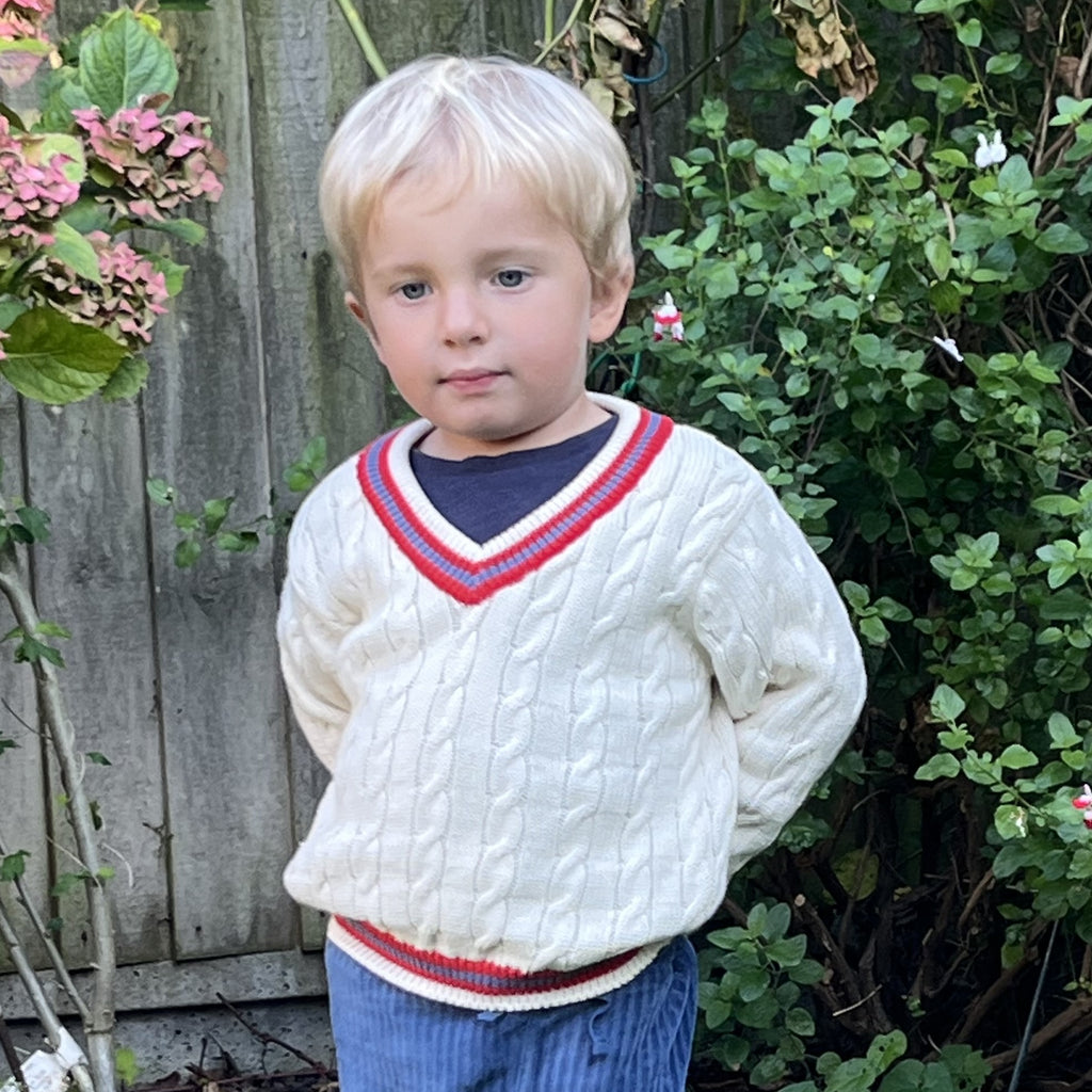 This is Theo's first Cricket Jumper, it is made in a soft breathable cotton. It features a cable knit and an attractive trim in Red and Blue, we think he looks very smart.