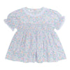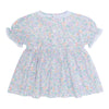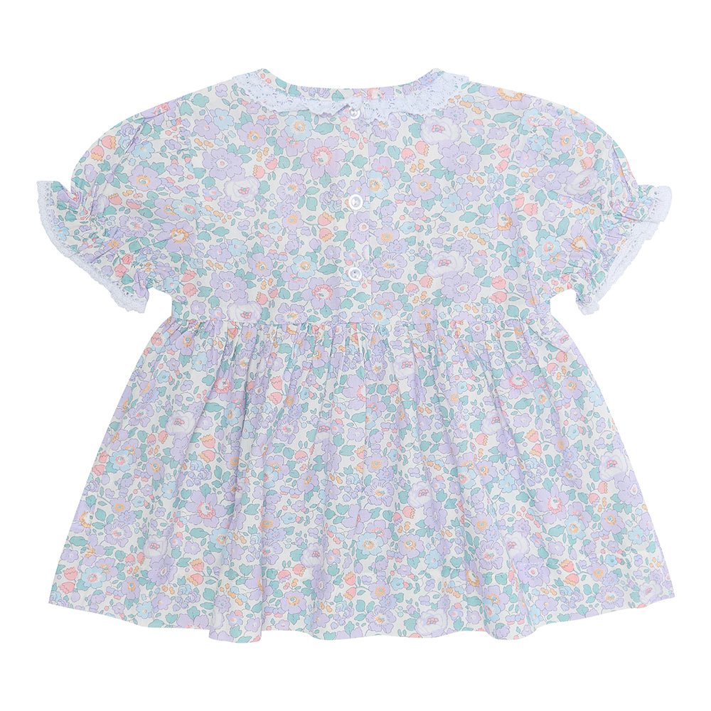 This sweet romantic dress in a dreamy Liberty like floral fabric would be lovely for parties or special occasions. It has lace around the neck and the sleeves. The waist is gathered and stretchy giving a very traditional look. The addition of white bloomers would give it a Vintage look.! Of course, as with all our clothing, both items are made in 100% Cotton..
