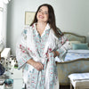 English Rose LinensThis gorgeous Dressing Gown has a pattern of blue red and green flowers on a white background. giving a lovely airy feel. It is a wrap-a-round style or KImono as are the others in the collection. They are made of 100%Cotton and they are one size. They make great gifts!