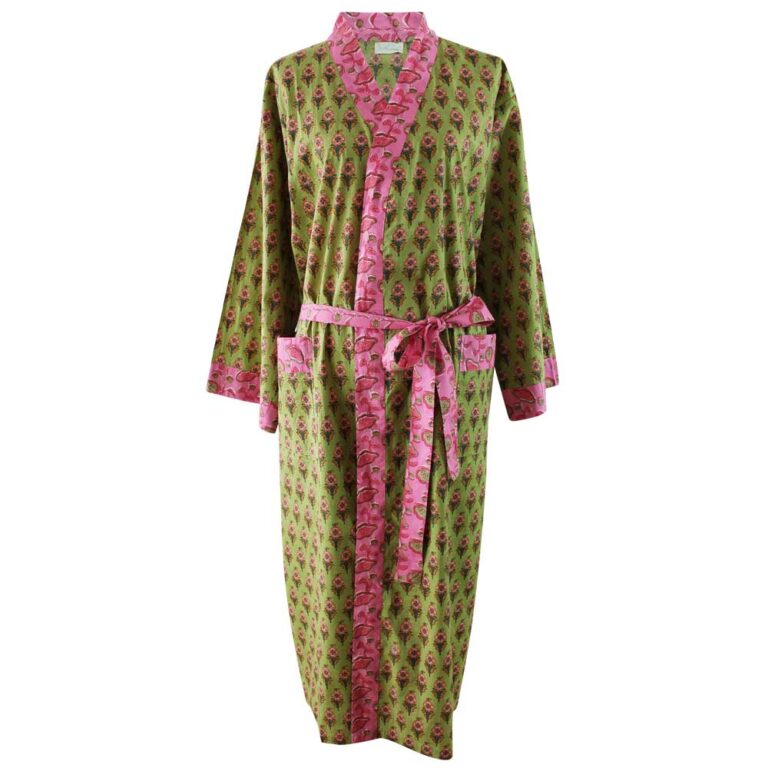English Rose LinensThis Kimono style Dressing Gown has pockets and is a wrap round style. The 100%Cotton fabric it is made in is a lovely pink and green print. It is edged with a pink binding and tie.