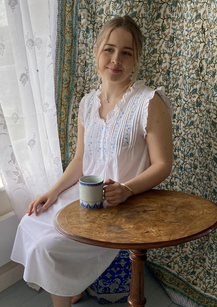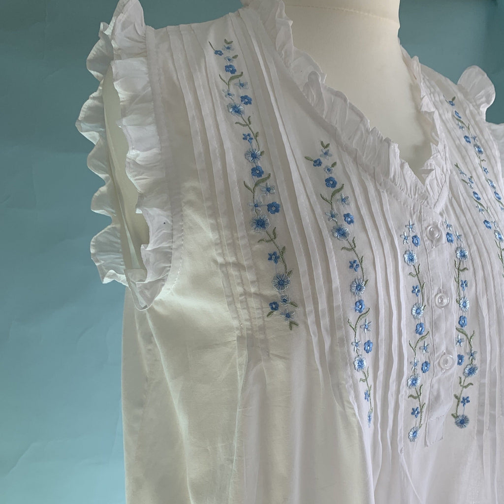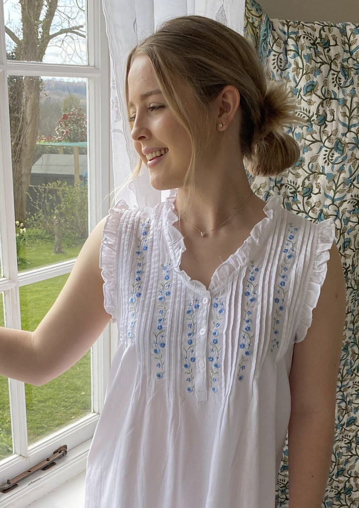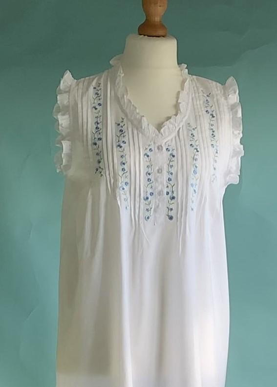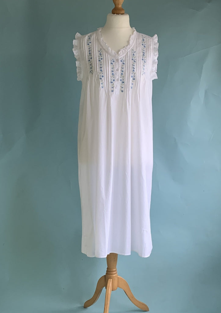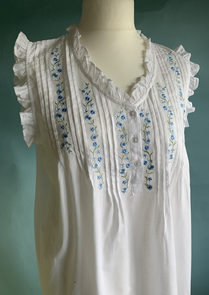 English Rose LinensBlue Christina makes you think of hot sunny days and blue skies or better still holidays and sun tan! It is sleeveless with a flirty frill around the armhole. The nightie is decorated with a heavenly blue and green embroidery.