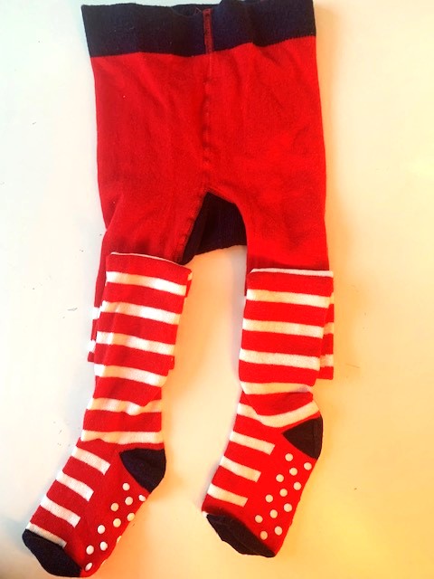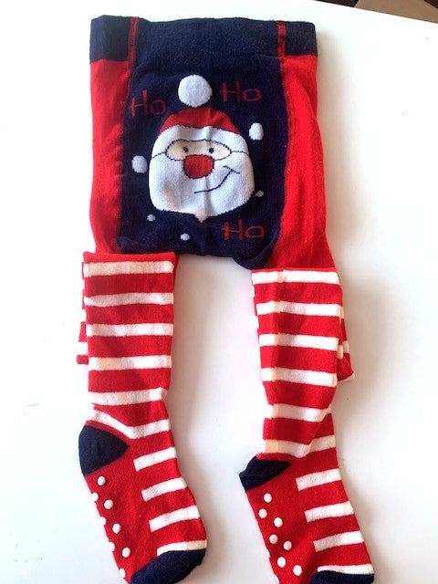 Super cute Santa and the words Ho Ho Ho on the bottom of the tights, red and white stripy legs with soft grip on the soles of the feet.