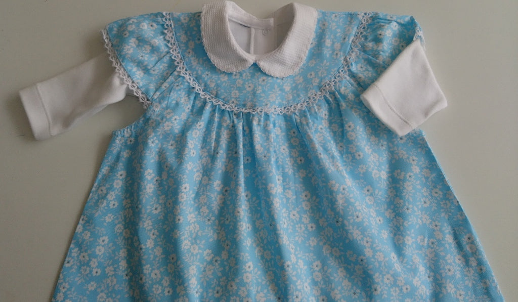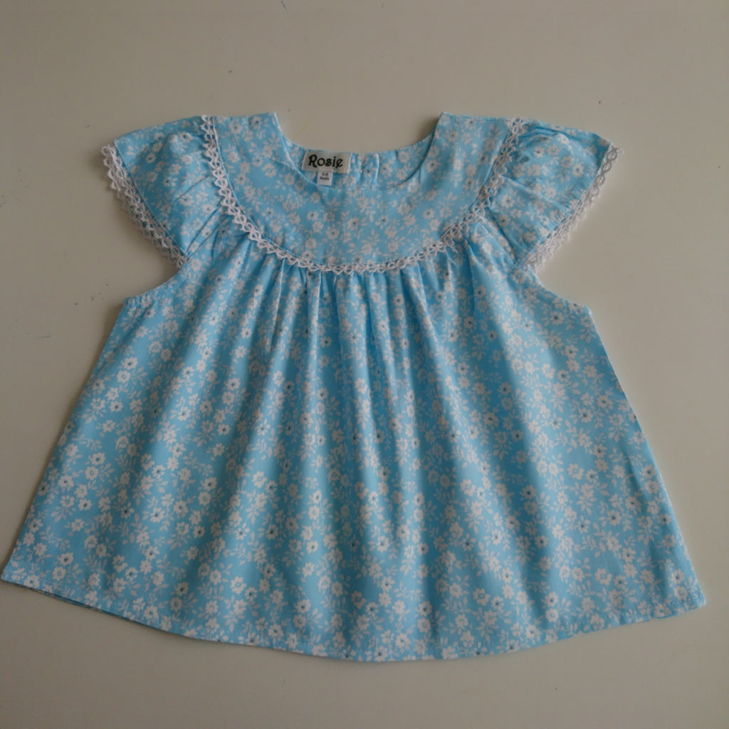 English Rose LinensThis is a beautiful baby top in fresh cool cotton. It is vintage inspired and made in a fresh, blue and white fabric. Delicate lace decorates the yoke and sleeves. It could be used on its own, or with a body/vest or a T Shirt underneath. Equally it could be worn with soft white bloomers to make another outfit.