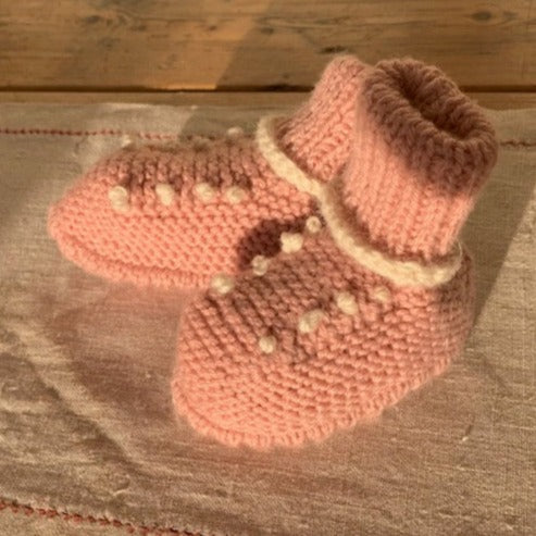 English Rose LinensThe knitting Granny has come up with some pink woolly bootees made with pure wool. They will be very warm for your little bundle.Little white dots to trim.