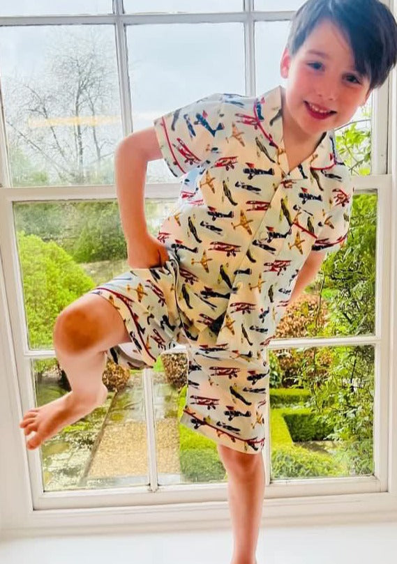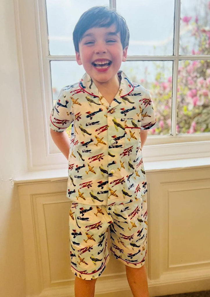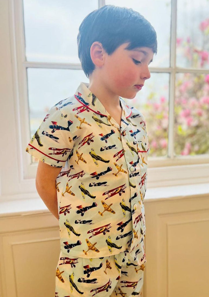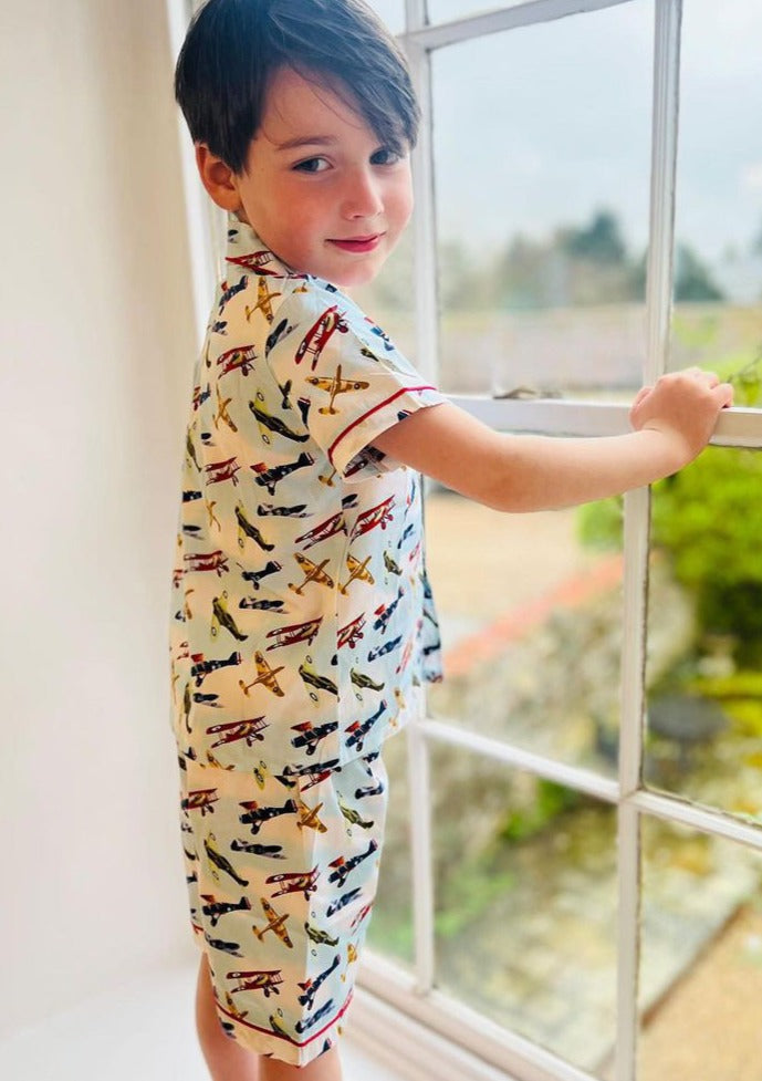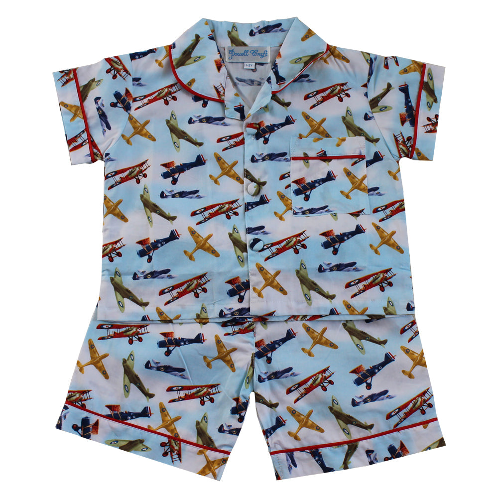 English Rose LinensThese are smashing pyjamas with short sleeves and shorts, - so perfect for boys who get hot. Vintage aeroplanes fly all over a bright sky blue background and red piping completes the very smart effect.