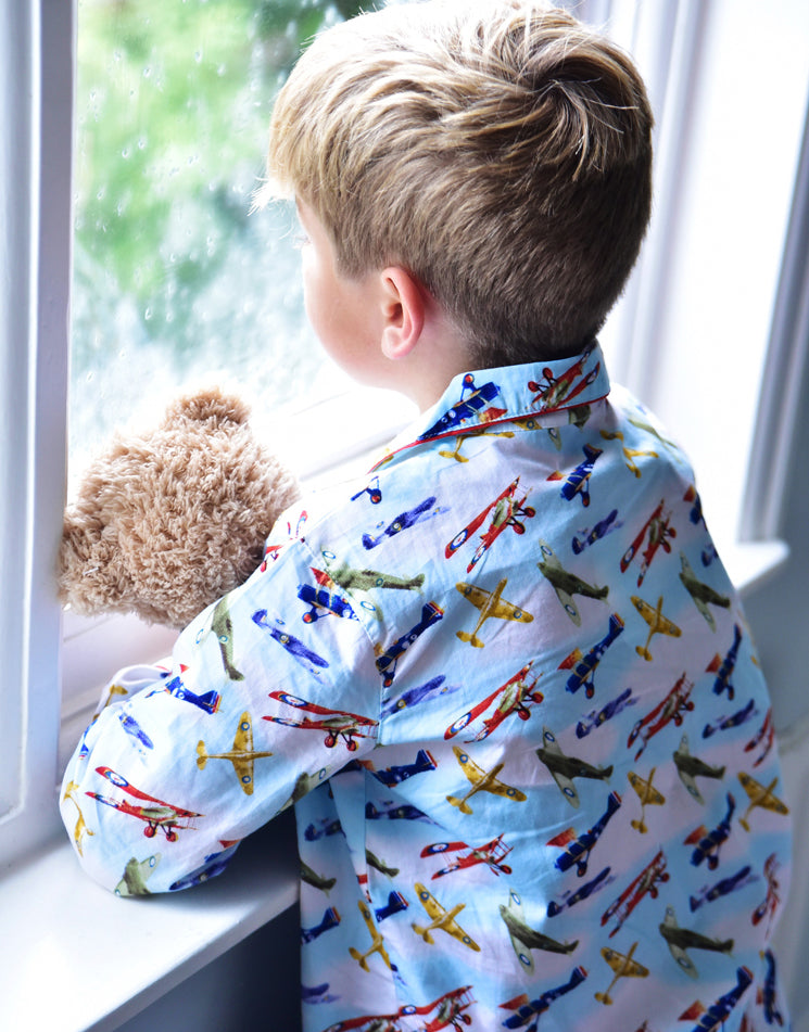 English Rose LinensVIntage Aeroplanes decorate these pyjamas and they are edged with red piping.