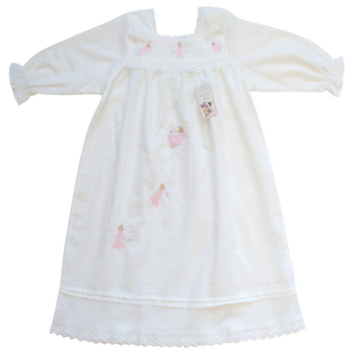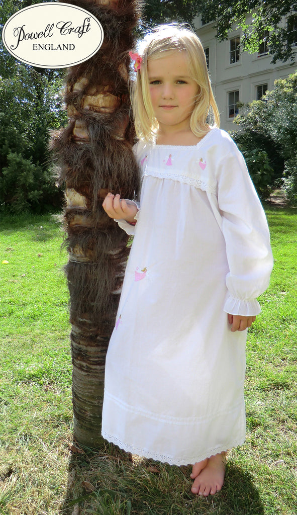 This nightie has long sleeves and is finished with dainty lace. Embroidered fairies flutter across the skirt and bodice. The square neckline is particularly pretty at the front and back. The nightie is made of a lovely soft cotton fabric. Little girls will love these bedtime fairies to help them go to sleep.