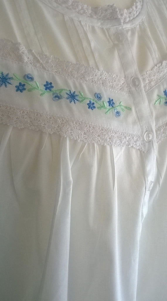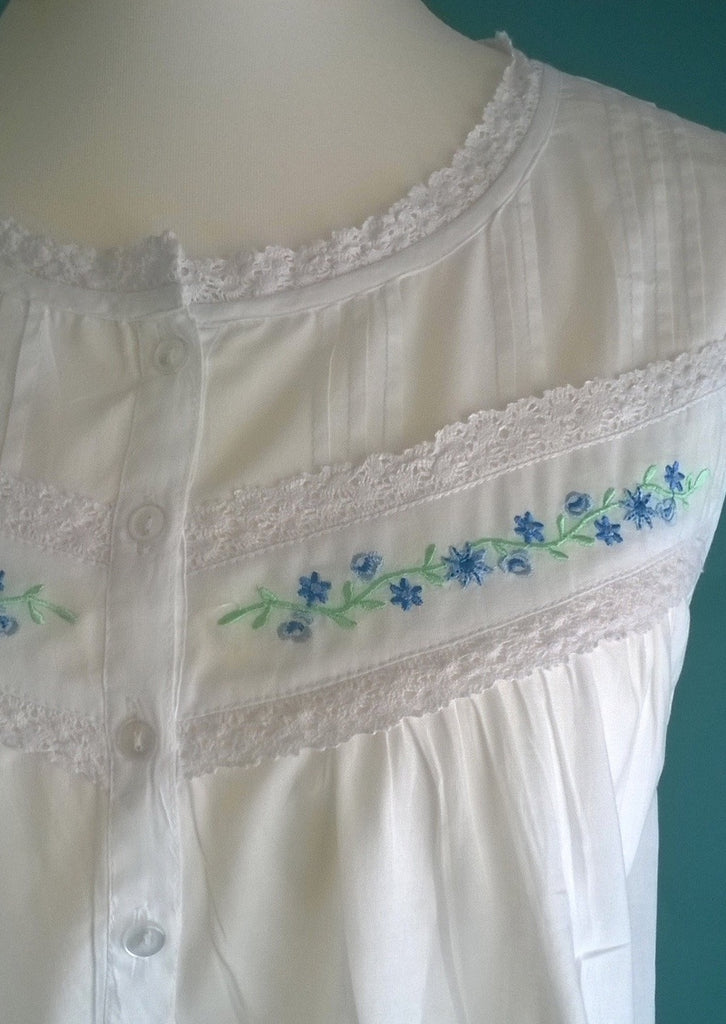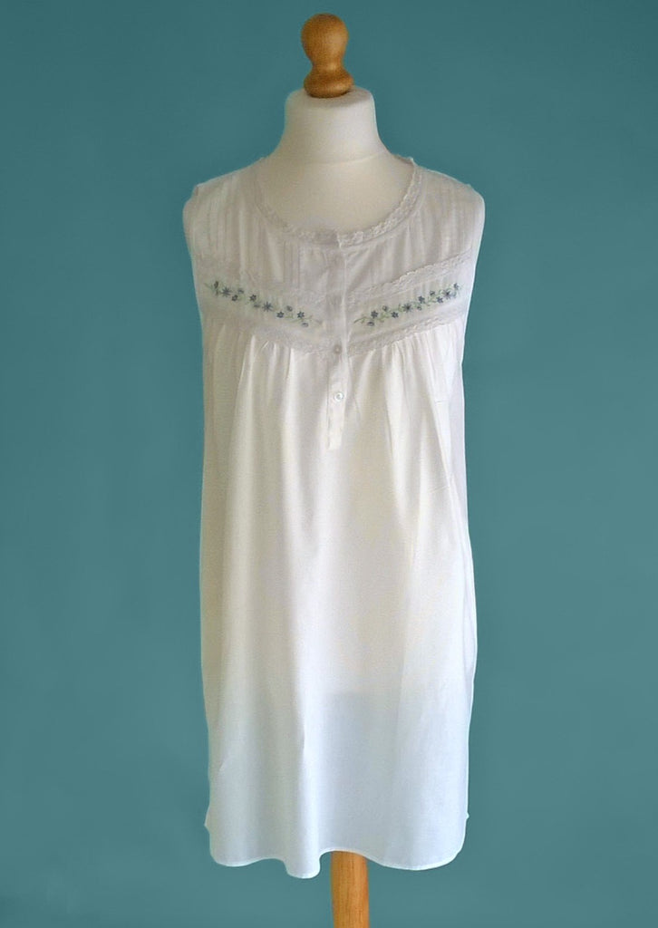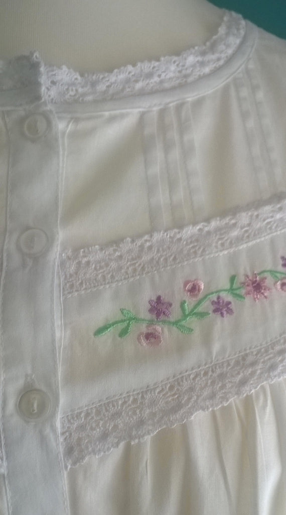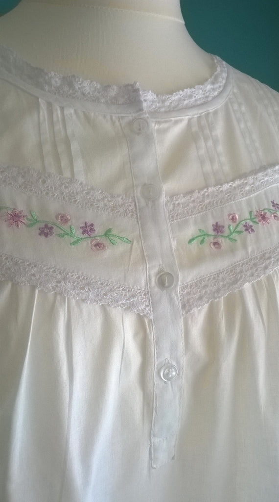 English Rose LinensShort simple and pretty, this nightie is available with pink embroidery. ( The blue is now finished). There are 4 buttons on the front opening, and pretty lace trimmings on the neckline and bodice.