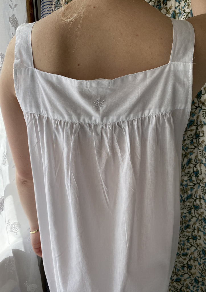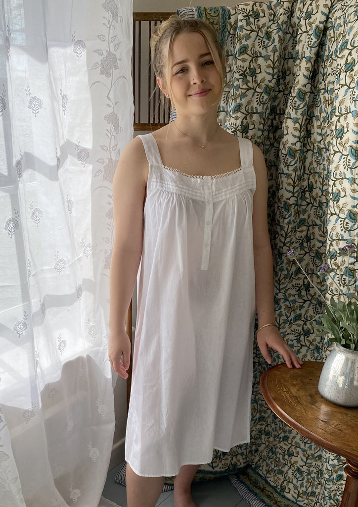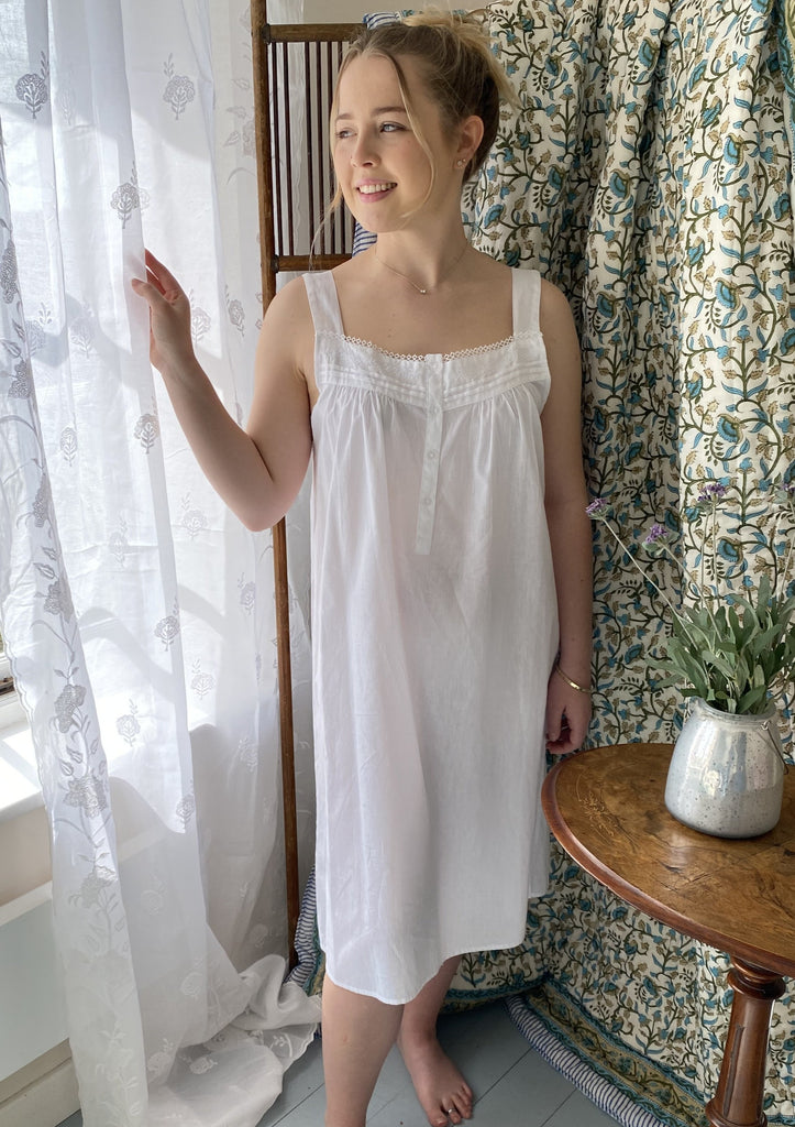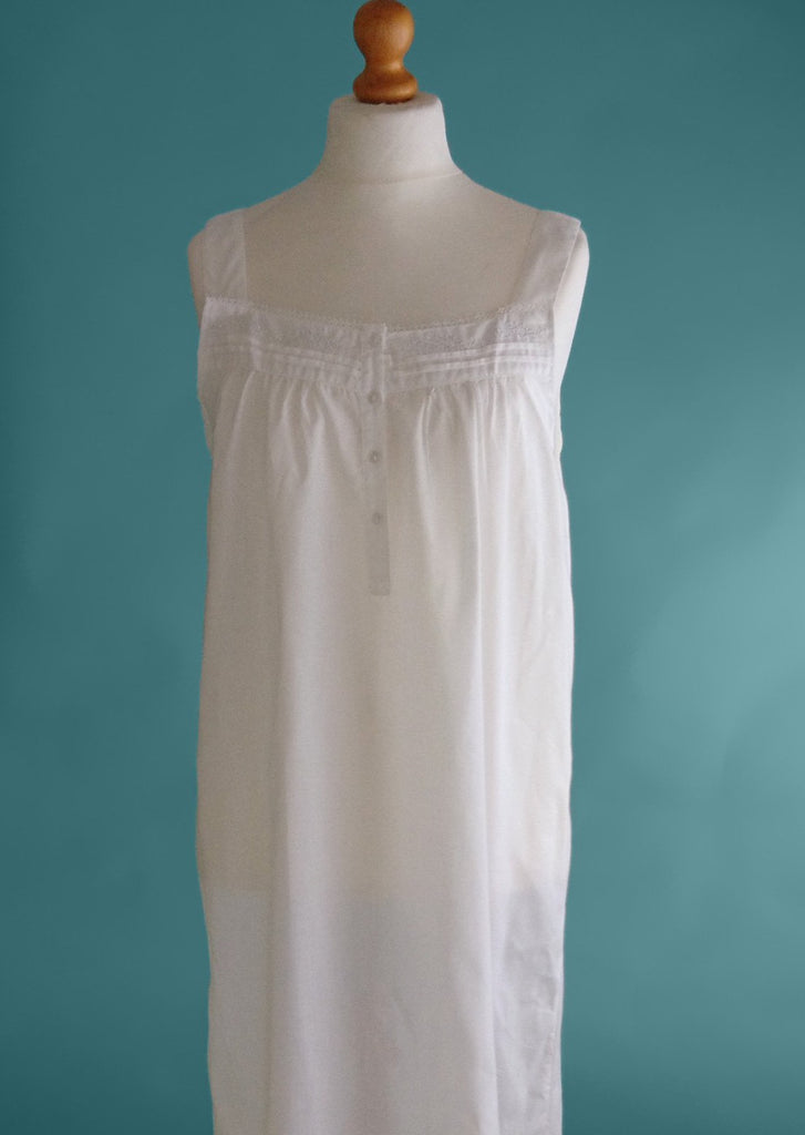 English Rose LinensThis Nightie is a simple design in 100% pure cotton. It is not too full ! It has wide straps and a square neck which is edged with lace. There is a front opening with four buttons, and the yoke is decorated with white embroidery. The back is lightly gathered with a sweet little embroidered flower on the bodice. The length is mid calf..