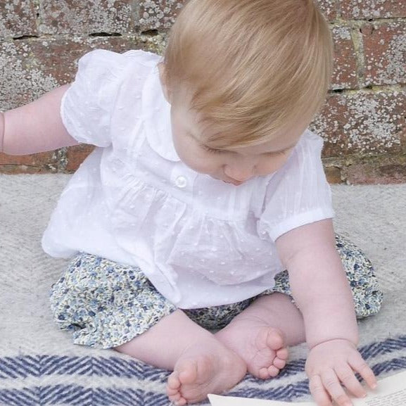 English Rose LinensA beautiful white blouse created from the softest white swiss cotton,this makes a very useful addition to a girls wardrobe. The swiss cotton it is made from is fine and light,so it is very comfortable to wear. The style is traditionally classic so it could be "dressed up or down"