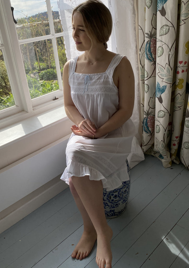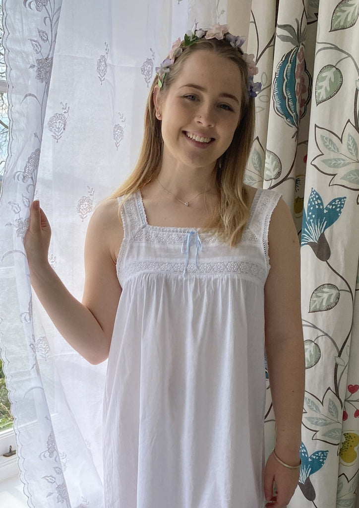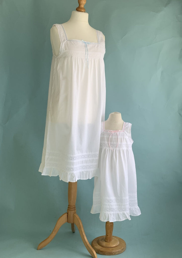 English Rose LinensLucy and Phoebe are summery sleeveless nighties. Lucy is for mummies and has broiderie anglais on the bodice and a blue bow. There is a frilled hem. Phoebe is exactly the same although with a pink bow. They are both lovely and cool so perfect for when the weather is hot!