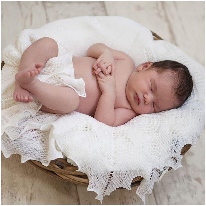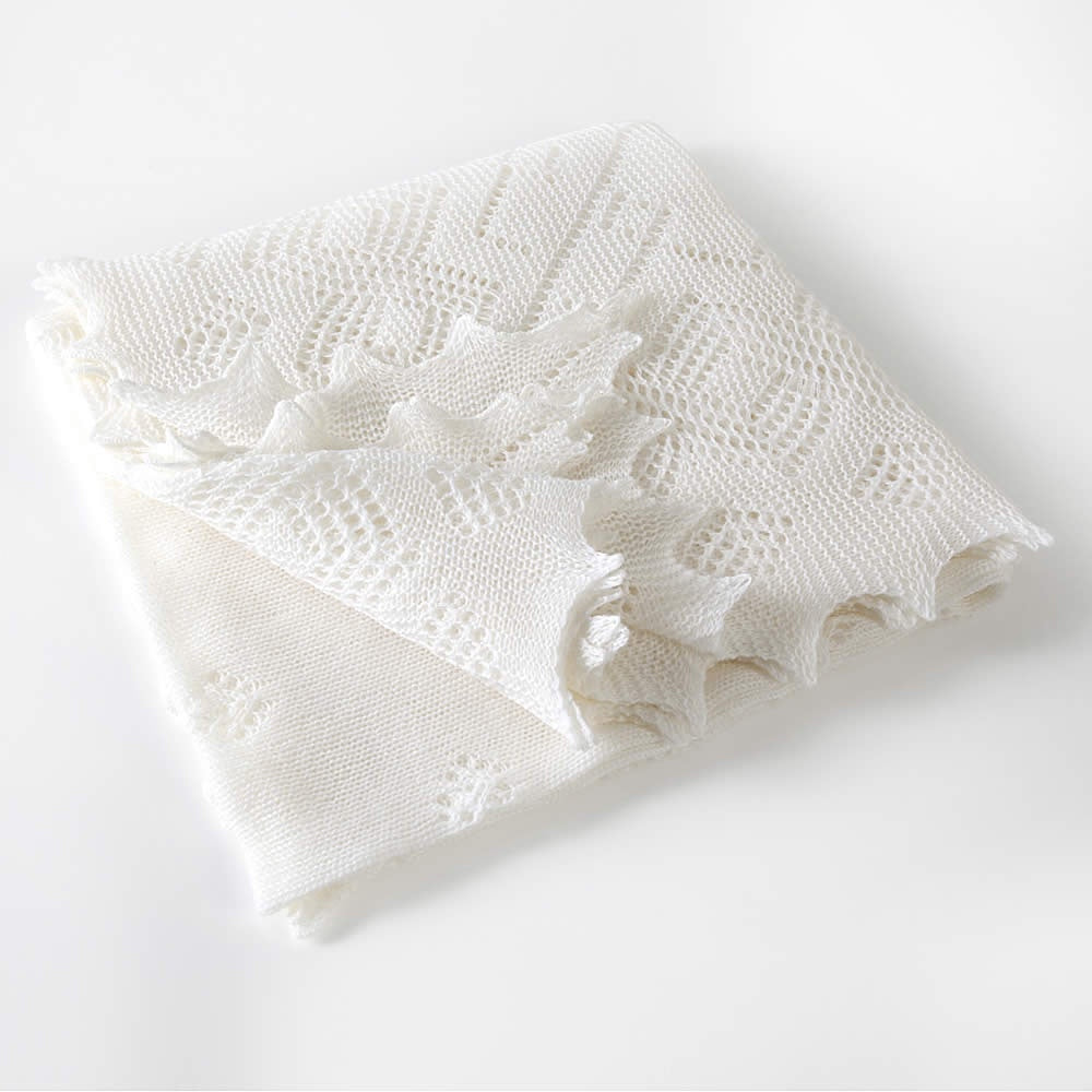 English Rose LinensThis beautiful, traditional shawl is made of the finest, softest merino wool and is perfect for your precious newborn baby! It is made to a classic pattern in Nottingham by a skilled team of knitters. Beautiful shawls like these have been made by the same company since 1912. Whilst perfect in those early days for swaddling your baby, it is useful too for those important photographs... for example the Christening.