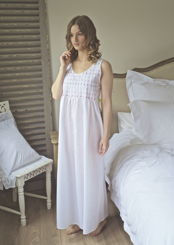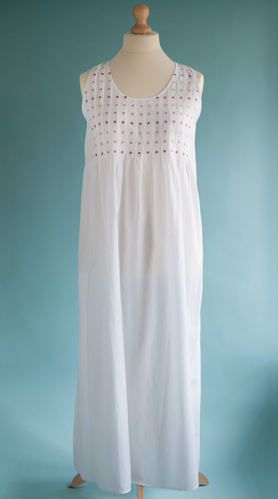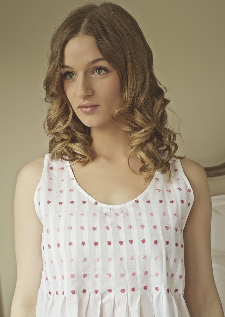 English Rose LinensThe Nightie is the same design as "Judith" but with a pink decoration of daisies on the front. It is a simple and elegant design, with a tucked bodice and a skirt which is lightly gathered. The high back keeps the shoulders in place. The cotton of this nightdress is of the highest quality making it a most comfortable nightie, especially in the hot weather.