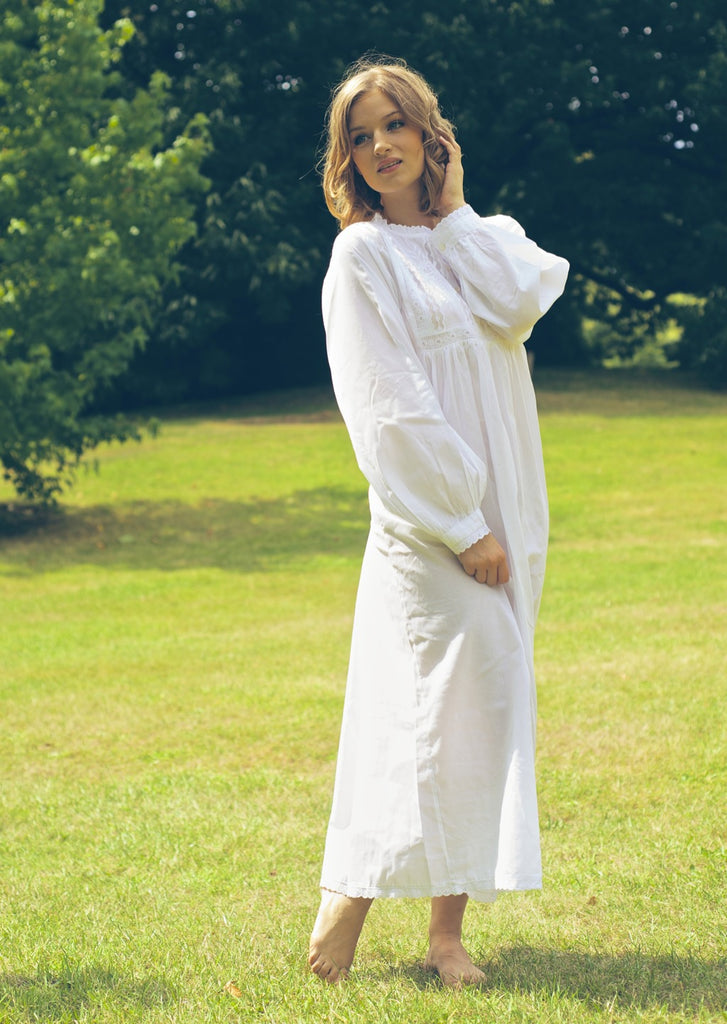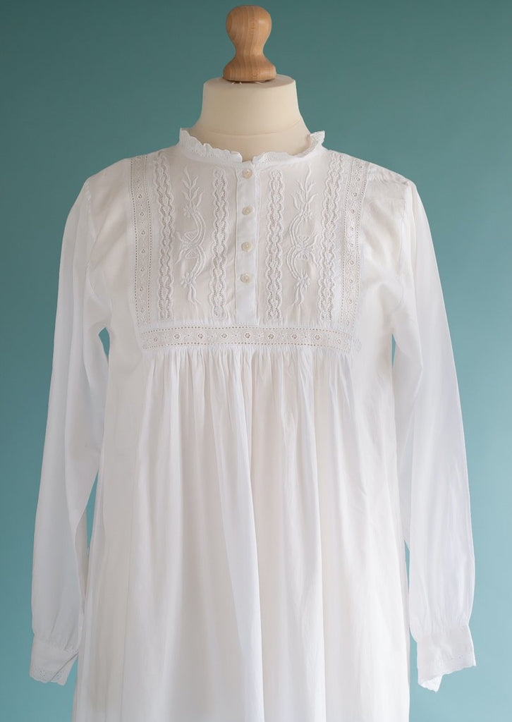 English Rose LinensIf you are looking for a "Pretty Period Nightdress" or an "Old Fashioned Nightdress" look no more! This nightie in beautiful soft cotton, has long sleeves. The yoke is embellished with beautiful lace and embroidery. This nightie is pretty, flattering and cosy to wear. It suits smaller sizes well but is also roomy too and is worn by many ladies from teenager to granny! There is also a larger size available.