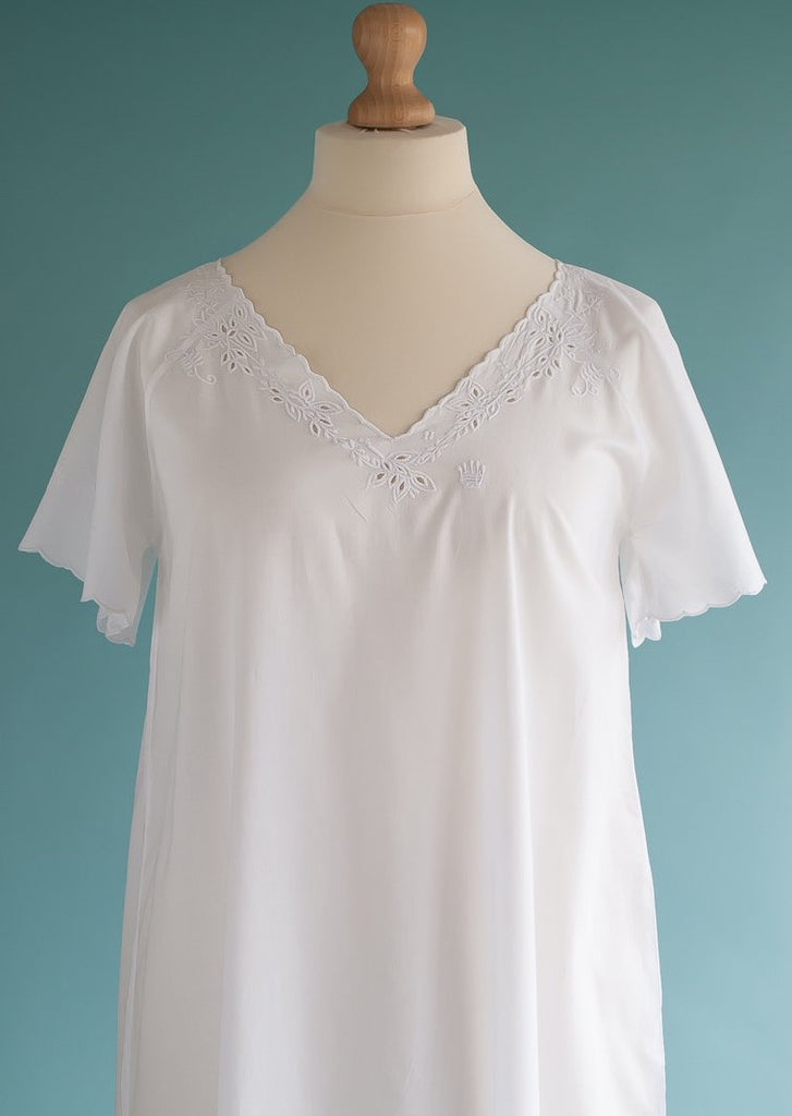 English Rose LinensThis is a very simple cotton nightdress with delicate cutwork decorating the v-neckline and sleeves and also the hemline. The short sleeve is raglan in design, making it very comfortable to wear. This nightie is made of the softest cotton, which becomes even softer over time.