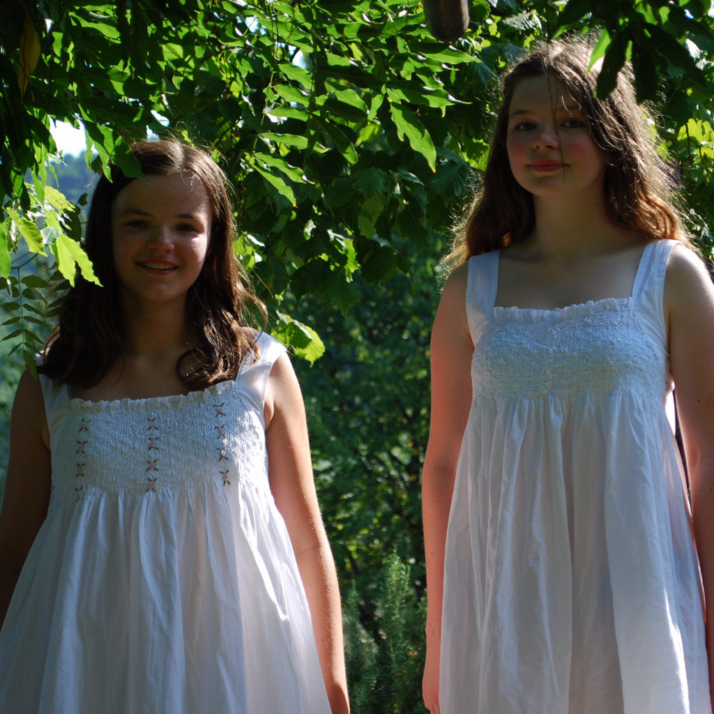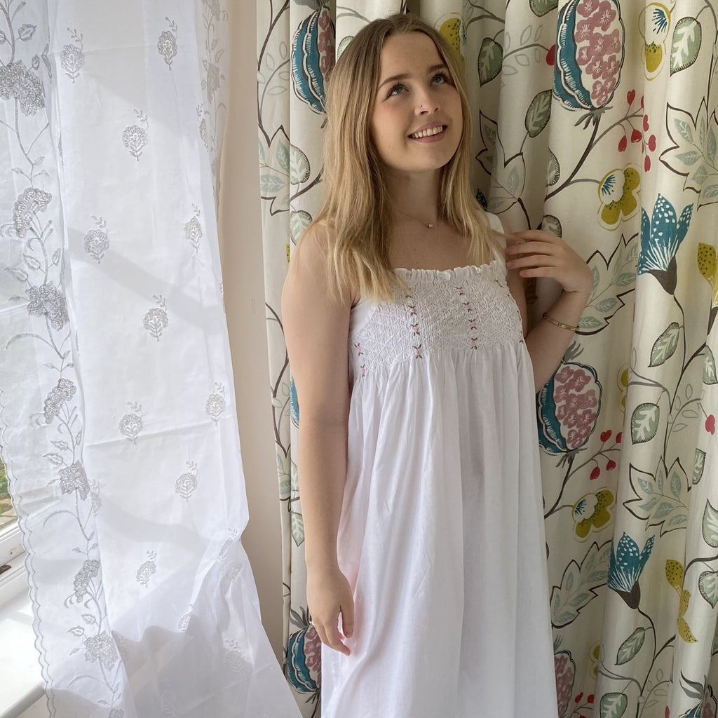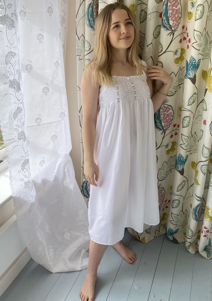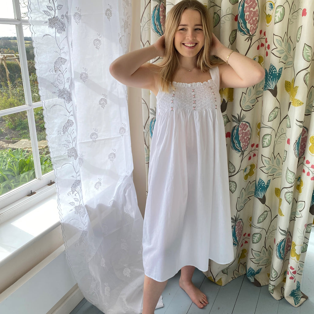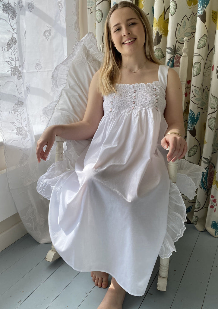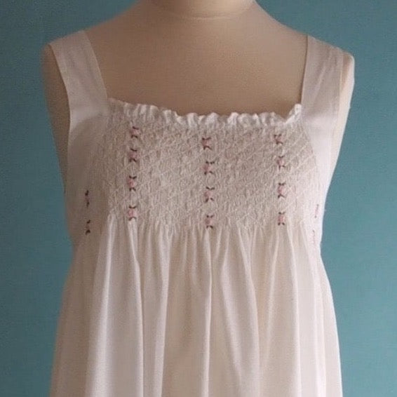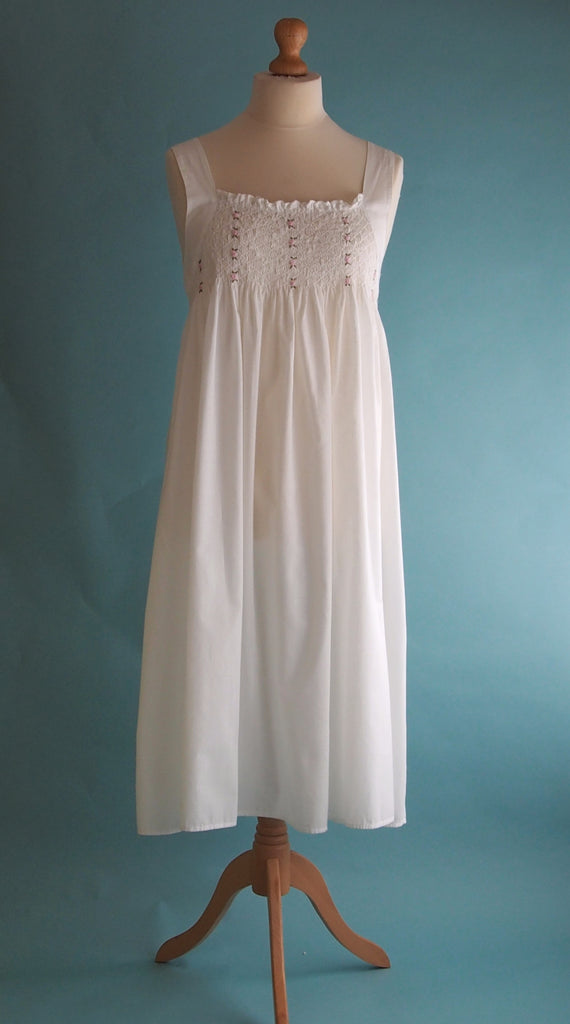 English Rose LinensPretty pink rosebuds decorate this lovely hand smocked cotton nightdress. It is made of 100% cotton which is delightfully soft to the touch. The shoulder straps are wide and stay firmly in place whilst in bed. The smocked bodice is short so that it doesn't grip tightly but gives the nightie a nice shape. The nightie is mid calf in length.