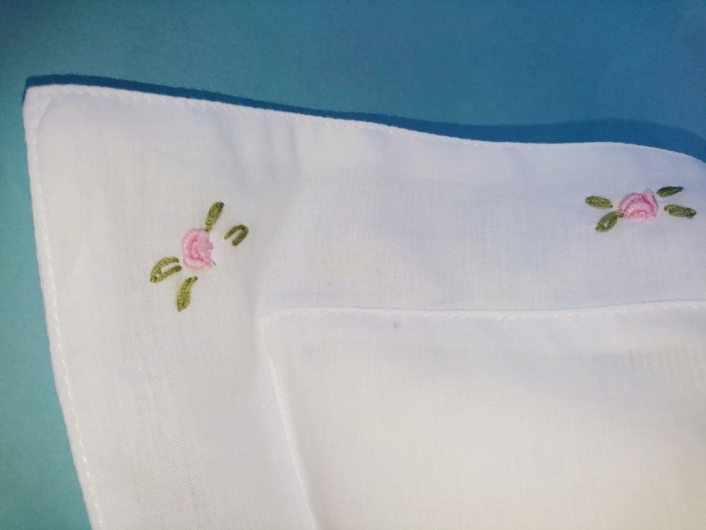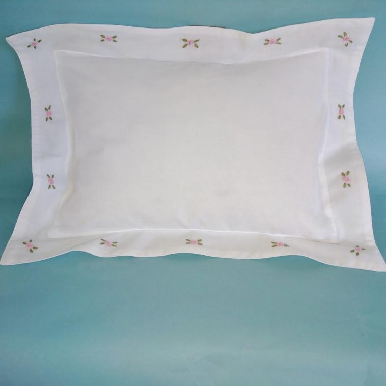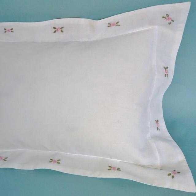 It is very pretty with hand embroidered rosebuds around the edge. You could use it simply as a decorative cushion on your bed!