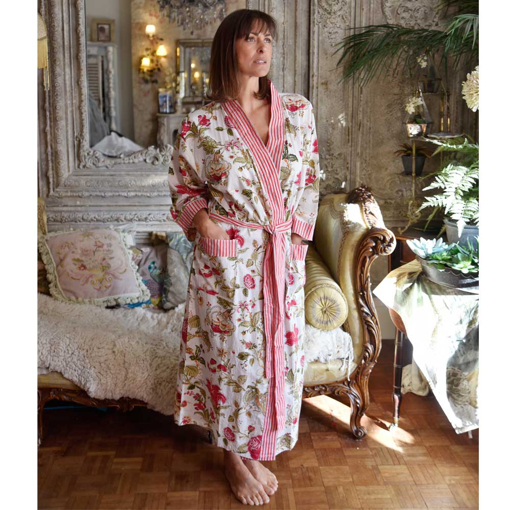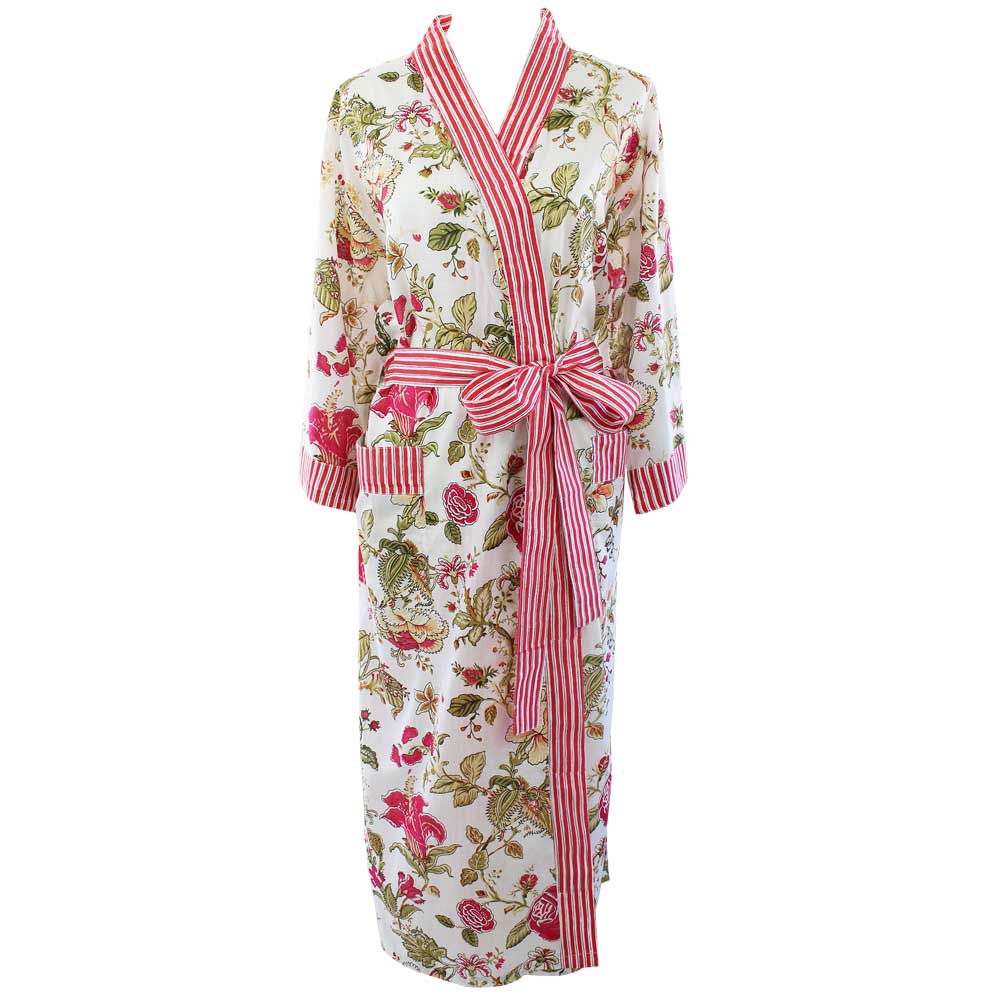 English Rose LinensEdged with a red stripey border, this is a colourful dressing gown ! There are lovely red flowers of all kinds. It is a very cheery gown to wear and is made ,of course in 100%Cotton. It is a wrap-a-round style and is ankle length.