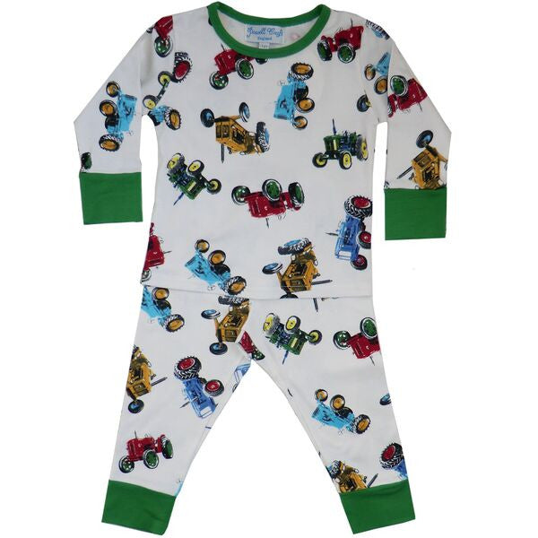 English Rose LinensThese Tractor Pyjamas are made with super soft jersey which is printed all over with vintage tractors.They are edged with green cuffs and neckline. Spot the Massey Ferguson !